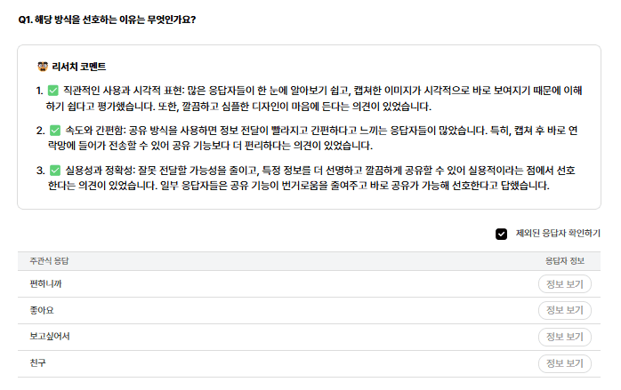 만약 유저스푼에서 리서치를 진행하게 되신다면 리서처 코멘트와 불량 응답 정제로 보다 쉽게 중요한 인사이트를 도출할 수 있을 거예요.