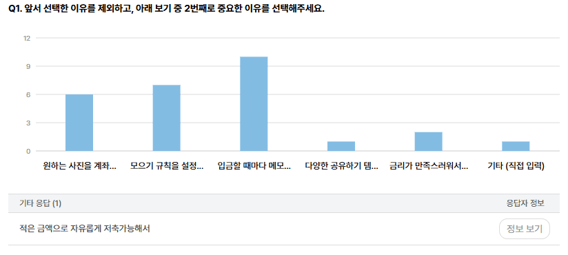 사용자는 대부분 자신과 동일한 최애를 좋아하는 사람에게 저축 내역을 공유하고 있었는데요. 만약 서비스 내에서 공통된 최애 그룹별 커뮤니티 기능을 신설하거나 개인이 자율적으로 *모임통장을 만들 수 있게 한다면, 여러 단계를 거쳐 서비스 외부로 공유하지 않고 신속하게 저축 내역을 공유할 수 있을 것이라는 새로운 가설을 세울 수 있게 된 것이죠. 사용자가 바라는 신속성도 충족하면서 사용자의 이용 형태를 기반으로 한 서비스의 방향을 제안할 수 있었어요.