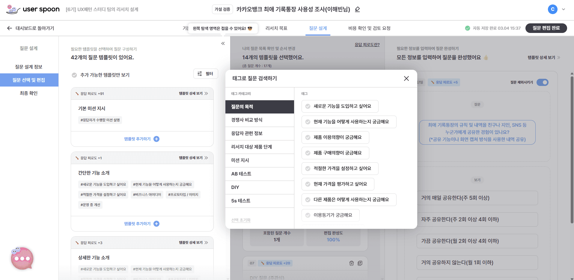 또 그렇게 리서치 목적을 상기시켜주는 덕분에 질문을 만들 때에도 리서치 목적에 벗어나지 않고 일관성 있는 설계가 가능했습니다. 모두 유저스푼 덕분이에요.