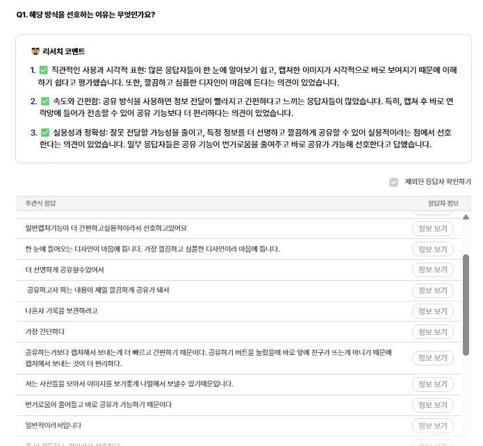 저는 결과 리포트에 기재된 리서처 코멘트가 좋은 참고가 되었습니다. 주관식 질문의 경우, 답변들을 일일이 읽고 공통된 패턴을 찾아내는 것이 중요하면서도 어려운 작업이잖아요. 그런데 그런 응답자의 다양한 의견을 종합하고 정리해 주는 리서치 코멘트를 통해 응답자가 필요로 하는 건 무엇인지 정확하게 파악할 수 있었어요.