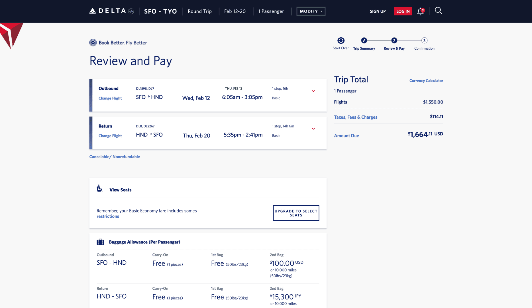 Delta Airlines는 체크아웃 단계에서 좌석 선택 및 추가 수하물 옵션을 깔끔하게 제공한다. 사용자가 원하지 않으면 쉽게 지나칠 수 있도록 설계하여 부정적인 경험을 최소화했다.