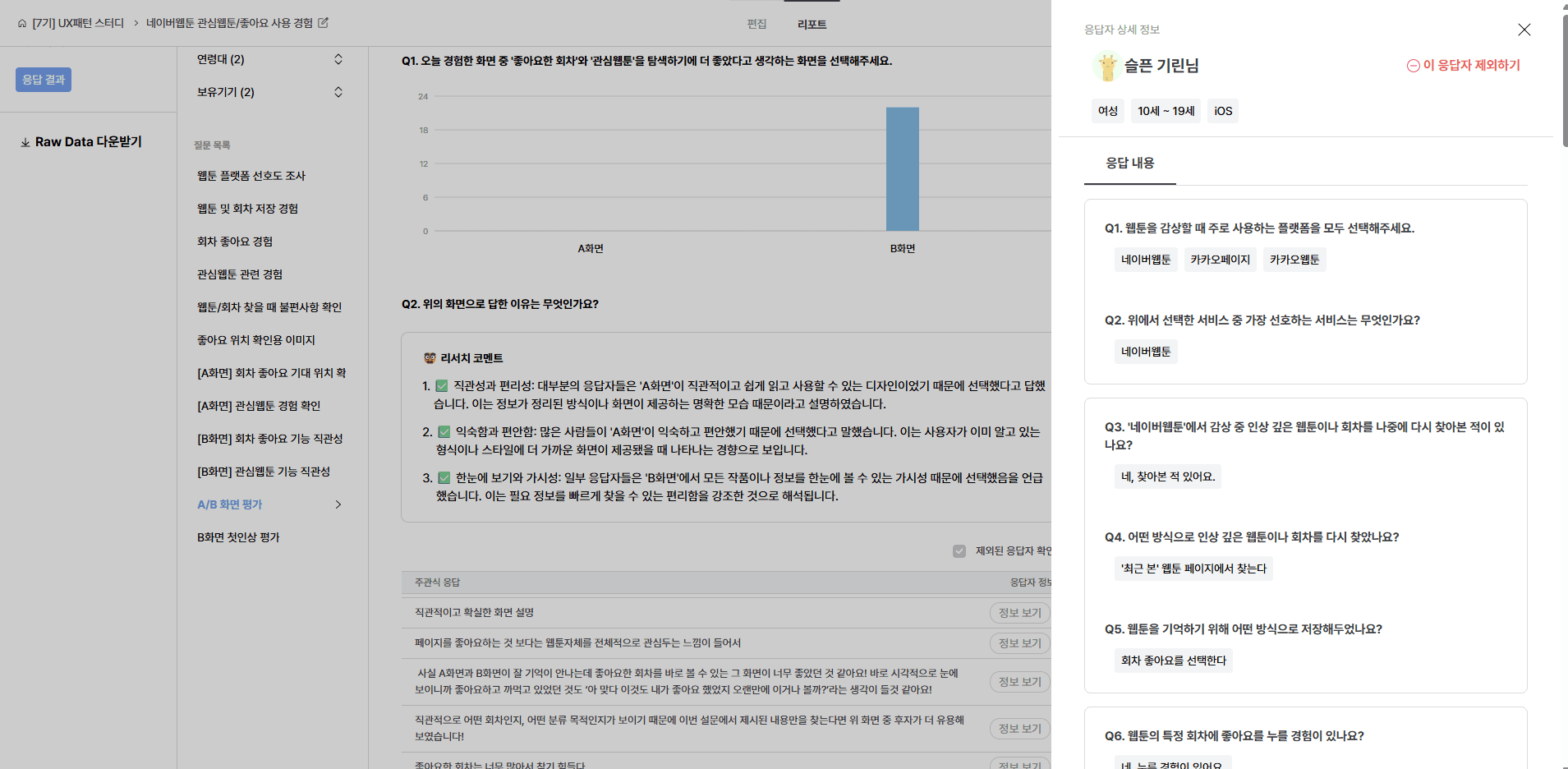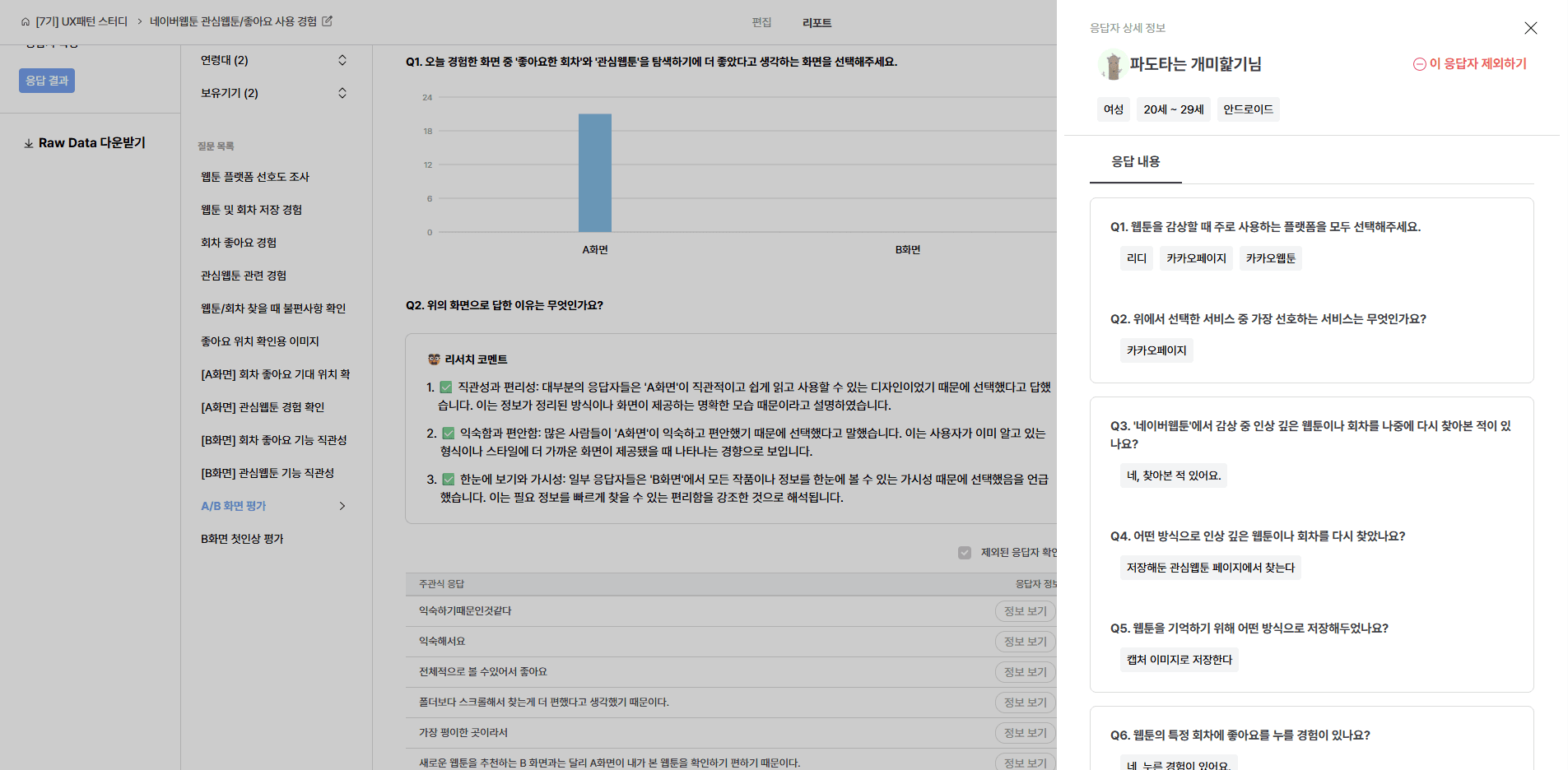 이전까지는 전체 응답자의 경향과 수치화된 데이터 위주로 결과를 판단했었는데, 이번엔 주관식 응답까지 함께 살펴보면서 사용자가 왜 그렇게 생각하고 행동하는지 더 깊이 이해할 수 있었어요.