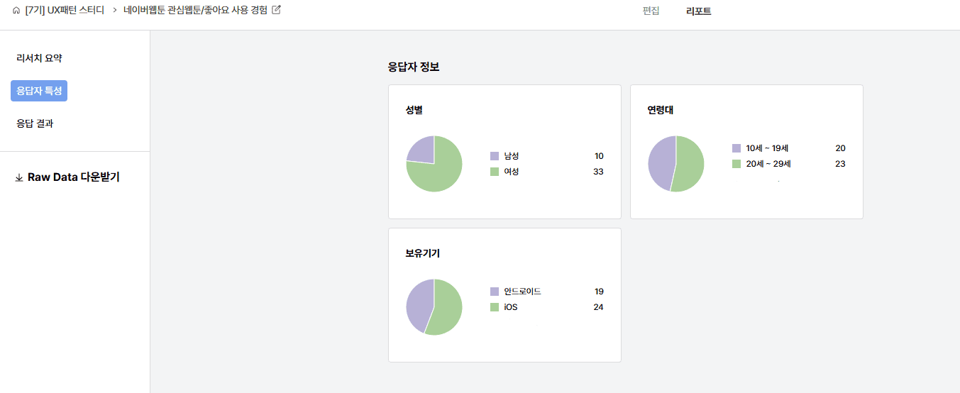 설계 단계에서 교차 분석할 문항을 미리 그룹화해두면, 리포트 결과 분석이 훨씬 효율적이에요. 저는 검증 목적별로 문항을 묶었는데, 한 화면에서 비교 분석이 가능해서 인사이트 도출이 쉬웠어요.