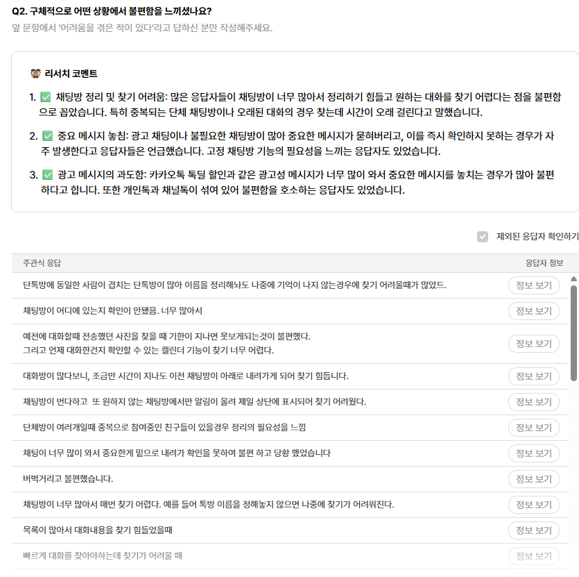 처음에는 ‘자주 쓰는 채팅방이 아래로 밀려서 불편하다’는 응답이 많을 거라 예상했지만, 실제로는 ‘상단 고정’ 기능이 많이 활용돼서인지 그 항목은 낮게 나타났고, 광고성 채팅으로 인해 정보가 묻히거나 실수가 발생한 경험이 훨씬 더 자주 언급되었어요.