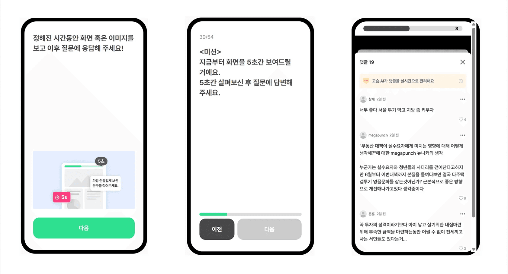 저는 뉴닉의 ‘고슴아, 물어봐’ 기능을 리서치했는데요. AI가 생성한 질문에 답하면 댓글이 등록되는 기능입니다.