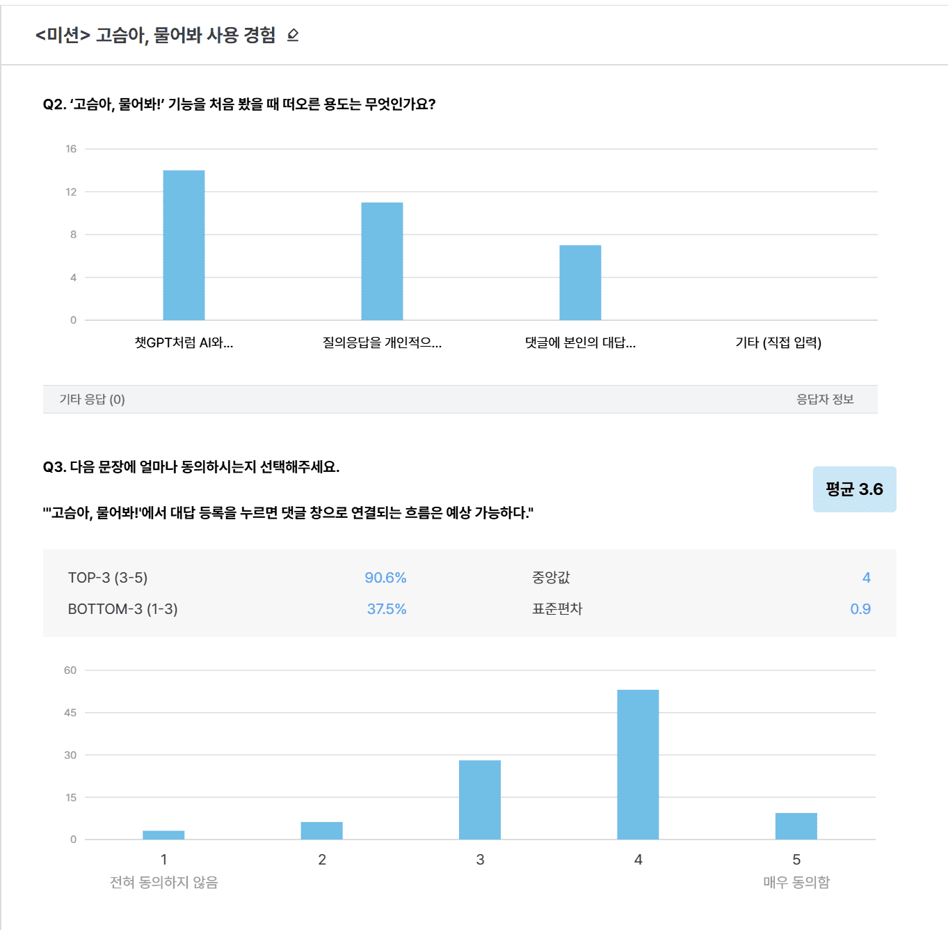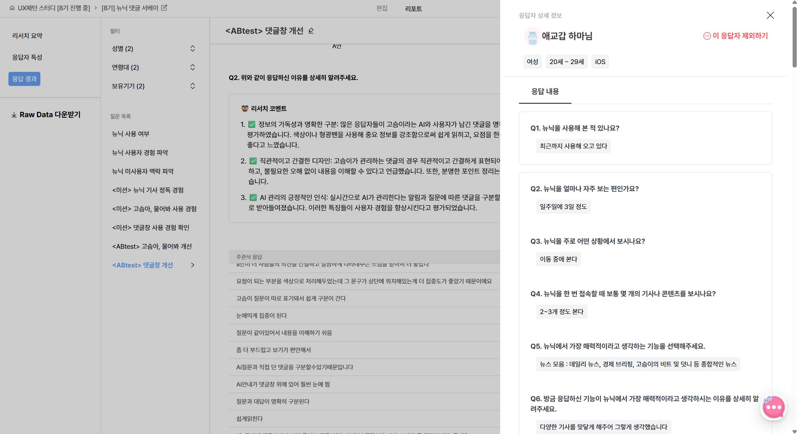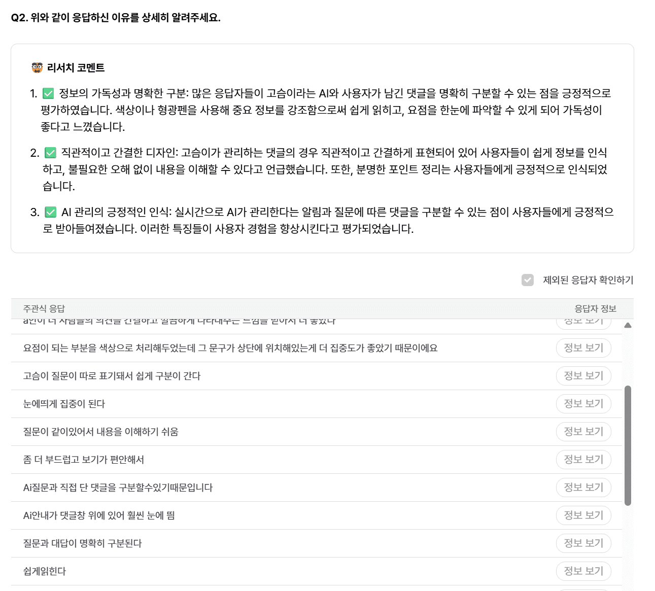 리서처 코멘트로 응답을 요약해주는 점이 편했어요. 굳이 다른 도구에 또 입력할 필요가 없으니까요. 물론 AI는 오류가 있을 수 있어서 결국 원문을 읽어야 하지만, 빠르게 파악하는 데는 유용했습니다.