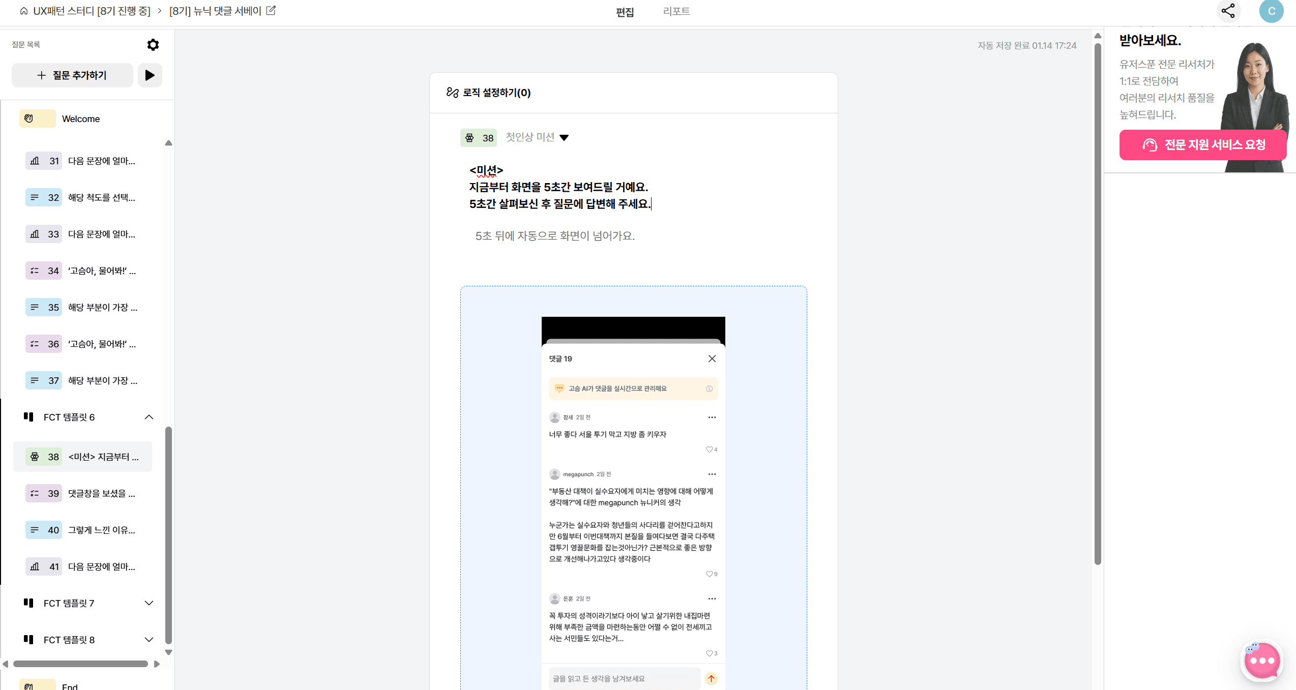 그 외에도 A/B 테스트, FCT 테스트 등 다양한 리서치 문항을 설계할 수 있고 편하게 결과를 받아볼 수 있었고요. 문항 템플릿이 있어서 백지 상태에서 막막함이 덜한 것도 좋았습니다.