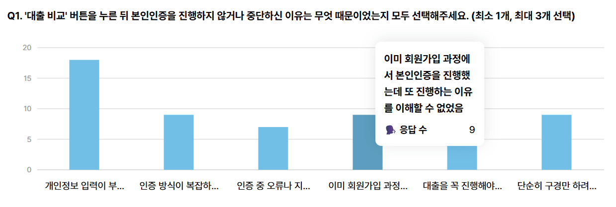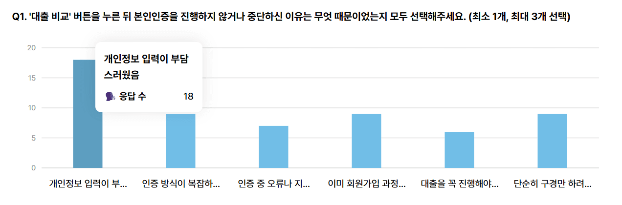 대출 상품을 조회하기 위해 회원가입 이후에 또 본인인증을 진행하는 이유를 이해할 수 없다는 응답이 **28.0%**나 된다는 점이 놀라웠습니다. 신분증 인증이나 개인정보 입력이 부담스럽고 번거로울 거라는 가설은 있었지만, 본인인증의 ‘필요성’ 자체가 납득되지 않는다는 지점은 예상하지 못했거든요.