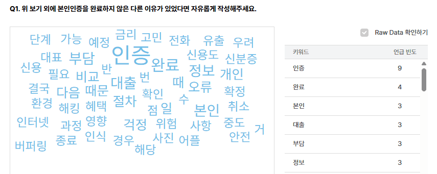 본인인증 과정에서 이탈하는 유저들은 본인인증 자체를 부담스럽게 느끼거나, 과정이 복잡하고 번거롭다는 인식을 강하게 갖고 있다는 점을 확인했습니다. 특히 예상보다 많은 유저가 ‘신용점수 하락’ ‘개인정보 유출’ 같은 위험을 우려하며 인증을 꺼려한다는 사실이 인상적이었어요.