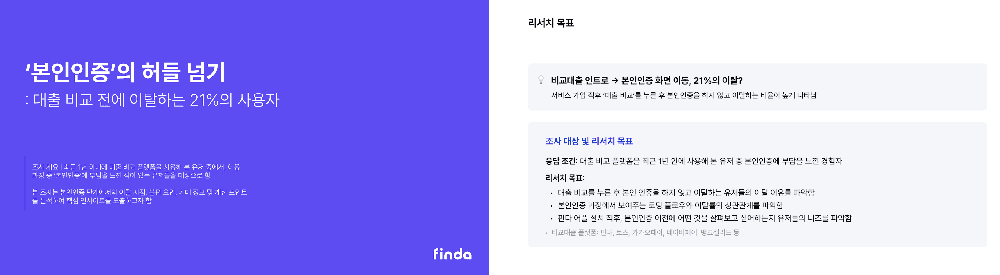 제가 진행한 리서치는 대출 비교 플랫폼을 사용해 본 유저 중 ‘본인인증’ 과정에 부담을 느낀 경험이 있는 사용자를 대상으로 했습니다. 본인인증 단계에서의 이탈 시점, 불편 요인, 기대 정보나 개선 포인트를 분석하고자 했어요.